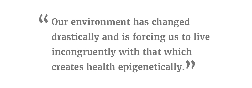 Fifty million Americans suffer from at least one autoimmune condition. Comparatively, 12 million suffer from cancer and 25 million from heart disease. This statistic cannot be explained with genetics, as genes don’t change or evolve that quickly. Rather, it points to the idea that our environment has changed drastically and is forcing us to live incongruently with that which creates health epigenetically. The current health care model is treating autoimmunity as an incurable disease whose manifestation can only be managed by suppressing the immune system. If we take a moment to consider the condition as an appropriate physiological response to environmental changes, then we will end up with an alternative protocol, one rooted in environmental changes such as diet, limited toxin exposure, sleep, exercise, and stress reduction.